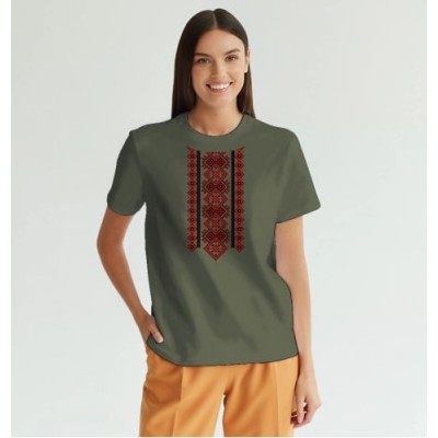 Головна сторінка > Одяг, взуття та прикраси > Женская футболка патриотическая с принтом Вышиванка S хаки